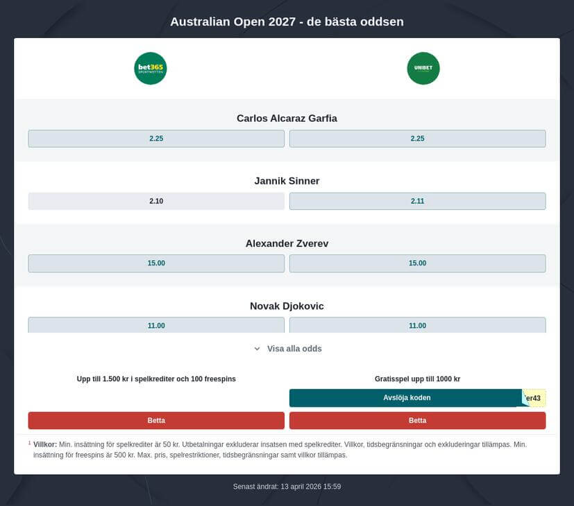 bet365 och Unibet Àr tvÄ av de mest relevanta alternativen för svenska spelare nÀr det gÀller Australiska öppna 2027 odds. BÄda brukar ha ett brett tennisutbud, mÄnga specialmarknader och liveodds under Grand Slam-turneringar, vilket gör dem anvÀndbara bÄde före turneringen och under pÄgÄende matcher.