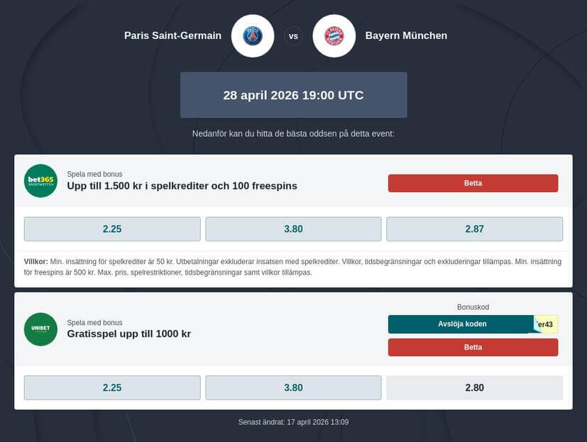 PSG - Bayern bästa odds och speltips är en semifinal som redan nu känns som ett tidigt finalmöte, inte minst eftersom oddsen på avancemang är så pass jämna. Just nu ligger Bayern runt 3.00 att gå till final, medan PSG ligger omkring 2.20 hos bet365, vilket säger en hel del om hur marknaden värderar dubbelmötet redan innan allt har hunnit sätta sig.