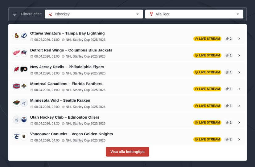 JohnnyBet erbjuder dagliga analyser och SHL spelförslag 2025/2026 från erfarna tipsters som följer ligan på djupet. Dessa experter väger in statistik, form, motivation och taktik för att skapa välgrundade rekommendationer. De använder även AI-verktyg för att hitta mönster som inte alltid är synliga för ögat.