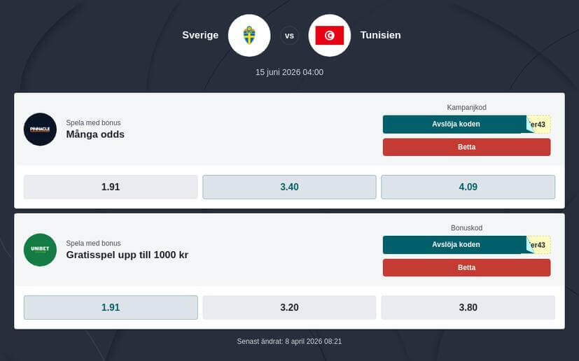 Sverige - Tunisien aktuella odds pekar just nu mot att Sverige ses som knapp favorit, med flera oddslistor runt 1.85 på hemmalaget eller snarare favoriten i marknaden, kryss kring 3.50 och Tunisien runt 3.80. Det är just den typen av skillnader som gör oddsjämförelsen viktig, eftersom små variationer kan ge bättre värde än att bara välja det mest uppenbara spelalternativet.